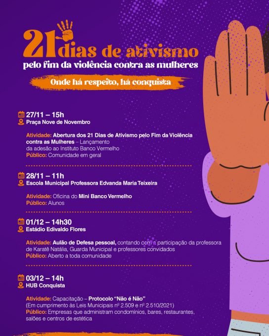 A abertura oficial da campanha “21 Dias de Ativismo pelo Fim da Violência contra as Mulheres”, uma iniciativa internacional que busca promover o respeito, a igualdade e o enfrentamento de todas as formas de violência de gênero, tem início nesta quinta-feira (27) em Conquista.