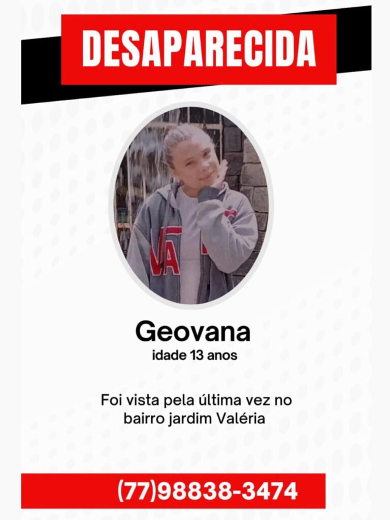 Um caso de desaparecimento tem gerado grande preocupação em Vitória da Conquista. A adolescente Geovana, de apenas 13 anos, está desaparecida desde o início desta semana.
