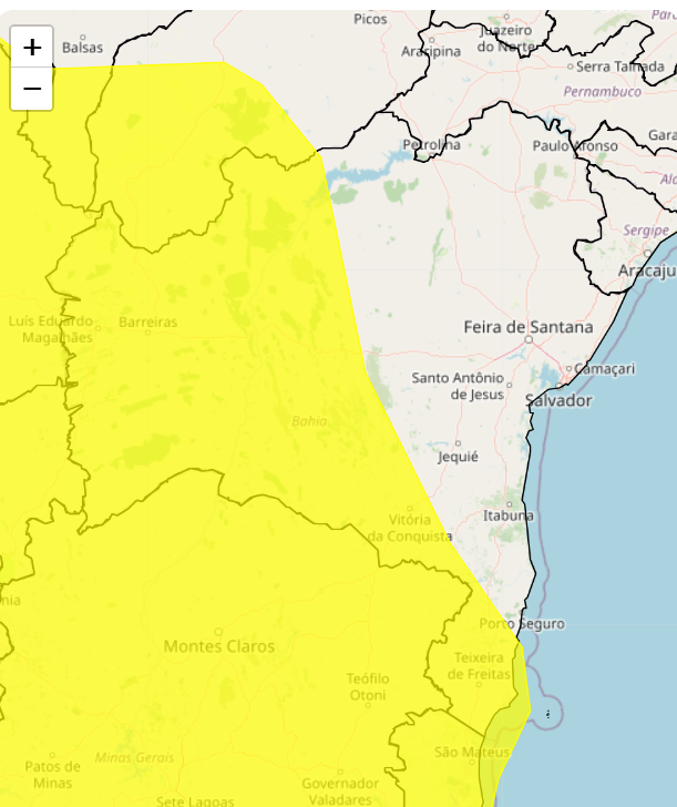 O Instituto Nacional de Meteorologia (Inmet) divulgou nesta sexta-feira (02) alerta amarelo para perigo potencial de chuvas intensas em Vitória da Conquista e mais 152 cidades baianas. De acordo com o instituto, podem ocorrer precipitações entre 20 e 30 mm/h ou até 50mm/dia, além de ventos intensos com 40-60 km/h. Há baixo risco de corte de energia elétrica, queda de galhos de árvores, alagamentos e descargas elétricas.
