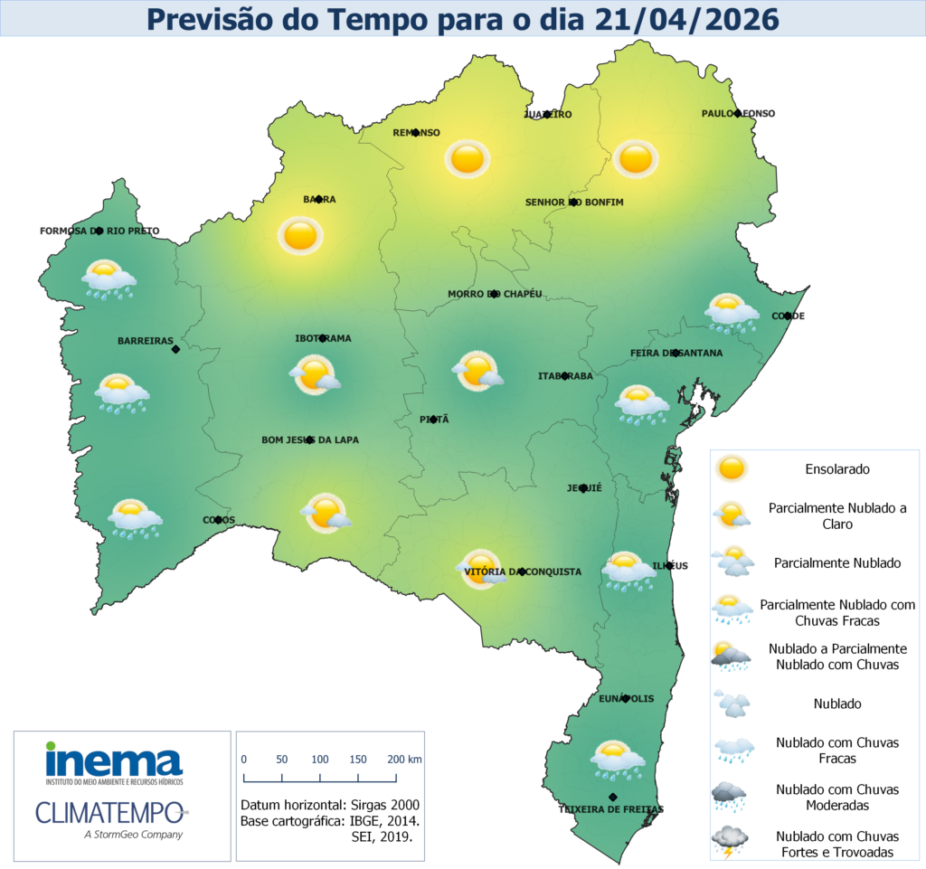 Terça-feira (21/04/2026): As instabilidades retornam ao. No litoral, incluindo Salvador, Região Metropolitana e Recôncavo, a previsão aponta para chuvas isoladas, alternadas com períodos de abertura de sol. No extremo oeste do estado, há possibilidade de pancadas de chuva ao longo do período.