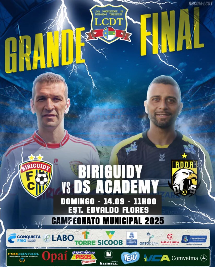 A disputa da grande final do Campeonato Municipal de Futebol (Série A), realizado pela Liga Conquistense de Desportos Terrestres (LCDT), em parceria com a Prefeitura Municipal, por meio da Secretaria de Esportes, ocorre neste domingo (14), às 11 horas, no Estádio Municipal Edvaldo Flores. O confronto será entre o Biriguidy, que foi campeão em 2019, contra o DS Academy, que está em busca do seu primeiro título.