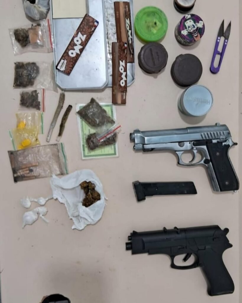 Após buscas no local, as equipes encontraram dois simulacros de arma de fogo e porções de substâncias análogas a entorpecentes. Segundo a PM, não foi possível identificar os donos dos materiais.