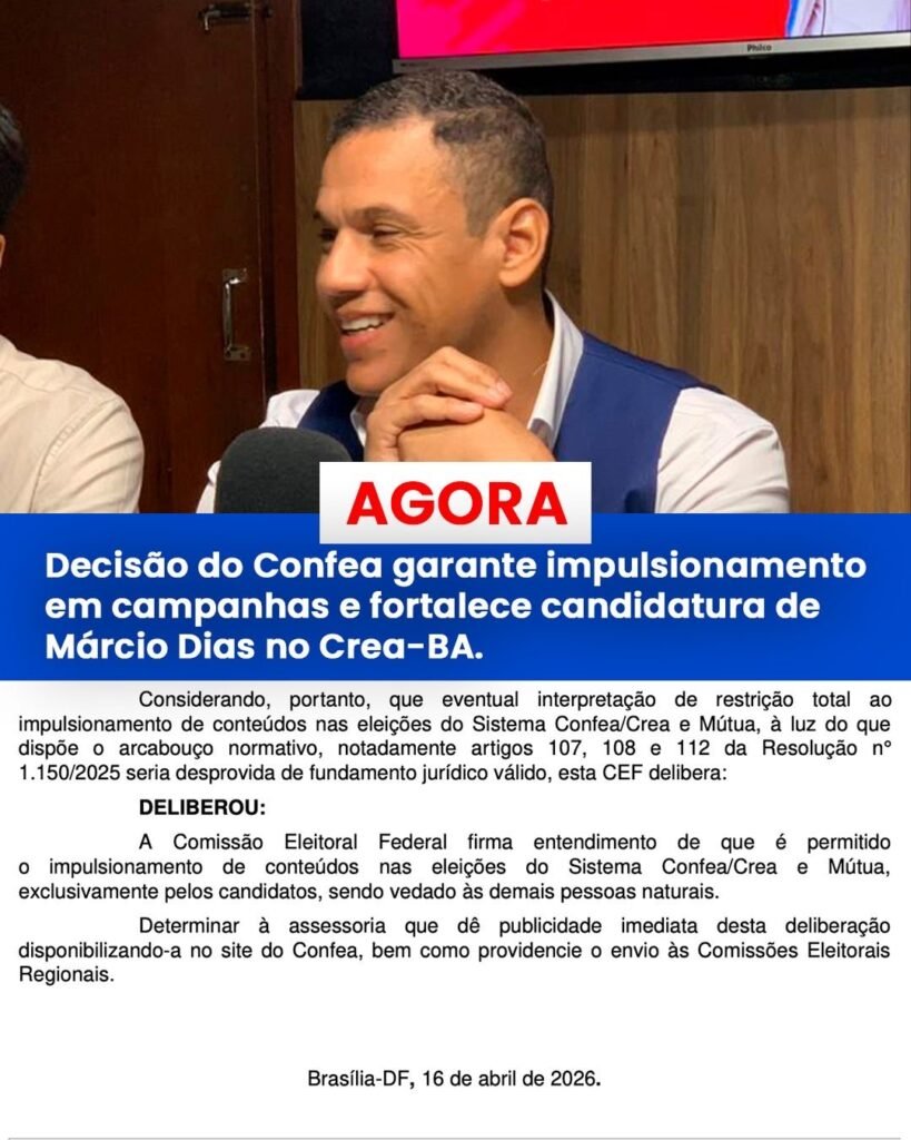 Nos bastidores, a decisão representa uma vitória direta do engenheiro Márcio Dias, que ingressou com medida liminar solicitando justamente a liberação do impulsionamento nas eleições do Crea Bahia. A iniciativa buscava corrigir o que aliados classificavam como desequilíbrio na disputa, já que a ausência dessa ferramenta limitava o alcance de candidaturas de oposição.
