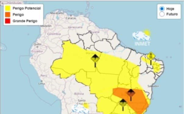 A previsão, segundo o Inmet, é que a temperatura máxima seja de 32° e mínima de 20°, com umidade máxima de 100%, mínima de 40%. Amanhã (4), a máxima permanece em 32° e a mínima é de 21°, com chuva entre 20 e 30 mm/h ou até 50 mm/dia, ventos intensos (40-60 km/h).
