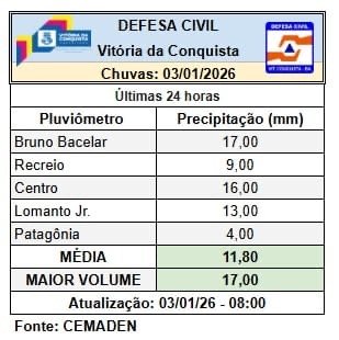 Neste sábado (3), Vitória da Conquista não está em alerta, mas até às 8h de hoje houve uma precipitação média de 11,8 mm, de acordo dados do Centro Nacional de Monitoramento e Alertas de Desastres Naturais. A previsão para hoje, segundo o Instituto Nacional de Meteorologia (INMET) é de chuva isolada de 1,7 mm, situação considerada normal. Já amanhã (4), o município entra em alerta amarelo.