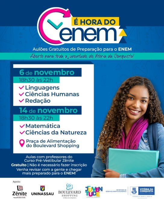 O Exame Nacional do Ensino Médio (Enem) está chegando e, por isso, a Prefeitura de Vitória da Conquista está realizando aulas gratuitas de revisão e preparação para o Enem. O projeto “É hora do Enem” é uma parceria da Secretaria Municipal de Desenvolvimento Econômico (SMDE), por meio da Coordenação de Juventude, com o Zênite, a Faculdade Uninassau e o Boulevard Shopping.