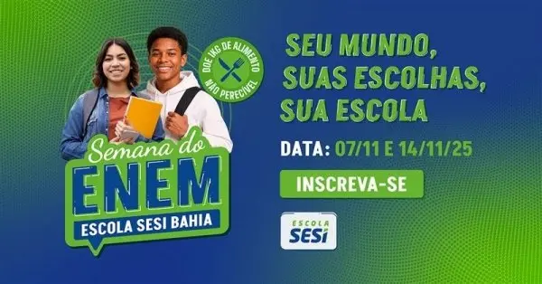 A Escola SESI Vitória da Conquista vai promover, nos dias 7 e 14 de novembro, uma aula de revisão para o Exame Nacional do Ensino Médio (ENEM). As atividades acontecem no Auditório da UESB, das 8h às 12h, e são abertas a alunos da Rede SESI e de outras escolas públicas e privadas.