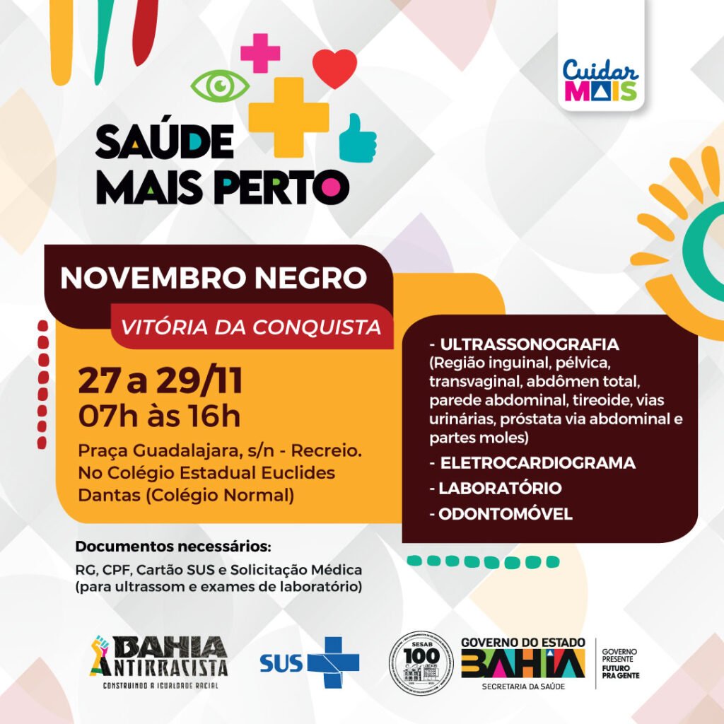 A Feira Saúde Mais Perto – Novembro Negro será realizada nos dias 27, 28 e 29 de novembro, das 7h às 16h, na Praça Guadalajara (Praça da Normal), em Vitória da Conquista. A ação tem como foco o atendimento à população negra da região, com oferta de serviços de saúde essenciais e gratuitos.