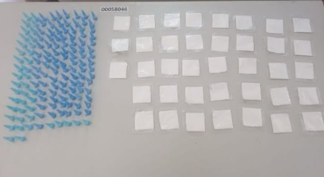 Durante a busca pessoal, foram encontradas 180 porções de substância análoga à cocaína (142 pinos e 38 papelotes), além de um aparelho celular e R$ 450 em espécie.