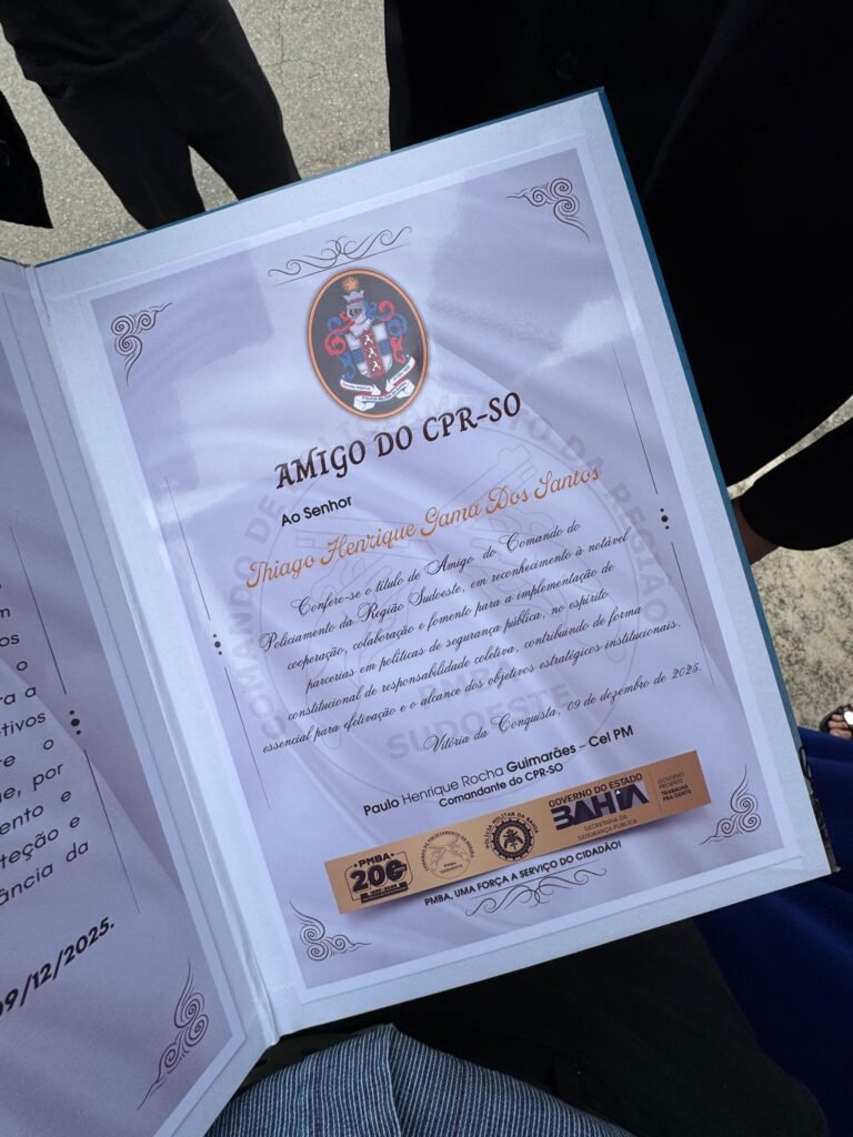 A certificação destaca a “notável cooperação, colaboração e fomento para a implementação de parcerias em políticas de segurança pública, no espírito constitucional de responsabilidade coletiva”, enfatizando que contribuições como a de Tiago são essenciais para que o CPR-SO alcance seus objetivos institucionais.