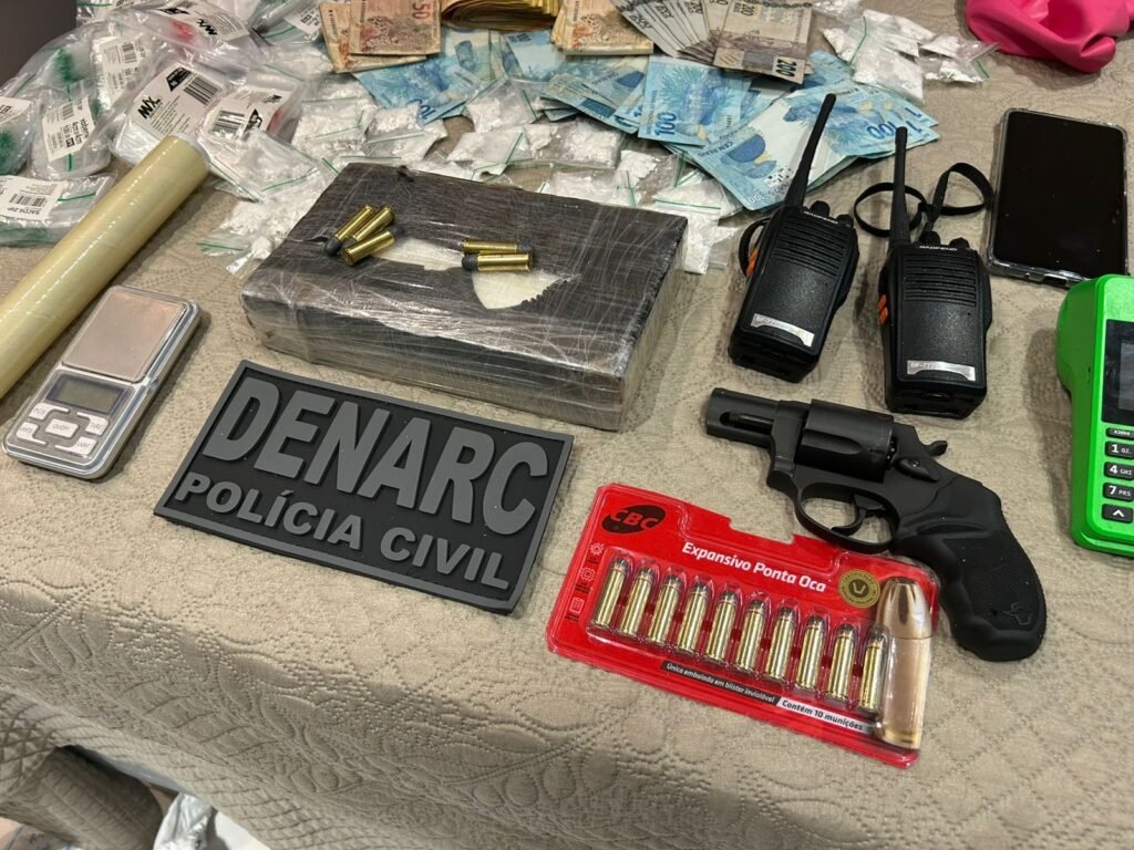 Um homem de 33 anos foi preso em flagrante, nesta sexta-feira (7), por tráfico de drogas e posse ilegal de arma de fogo e munições, durante ação da Polícia Civil da Bahia. O cumprimento do mandado de busca e apreensão foi realizado no bairro Felícia, em Vitória da Conquista, e resultou na apreensão de porções de cocaína prontas para comercialização, um tablete da droga prensada, balanças de precisão, milhares de embalagens utilizadas no preparo do entorpecente, além de um revólver calibre 38 e dinheiro proveniente da atividade ilícita.