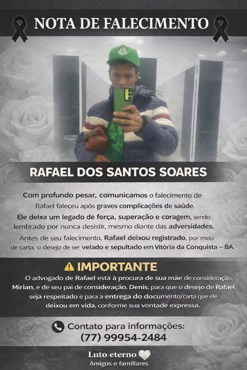 De acordo com informações de amigos próximos, Rafael residia em Vitória da Conquista e havia viajado para São Bernardo do Campo para receber um valor financeiro e uma placa comemorativa. O retorno para a Bahia estava previsto para o dia 20 deste mês, o que não chegou a acontecer.