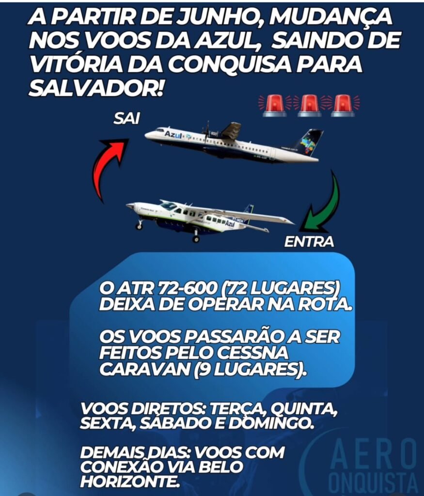 De acordo com informações verificadas nos canais oficiais de venda da companhia, a partir de junho de 2026 a rota (VDC–SSA–VDC) passará a ser operada exclusivamente com a aeronave Cessna Grand Caravan, da Azul Conecta, com capacidade para apenas 9 passageiros.