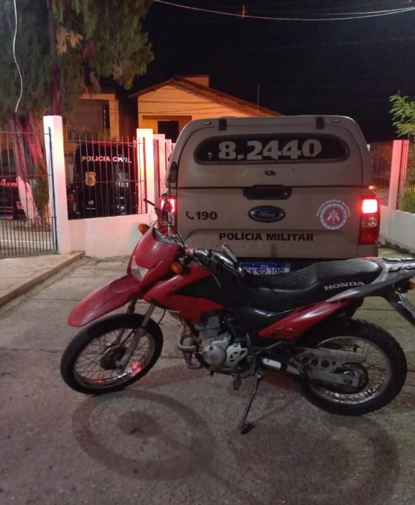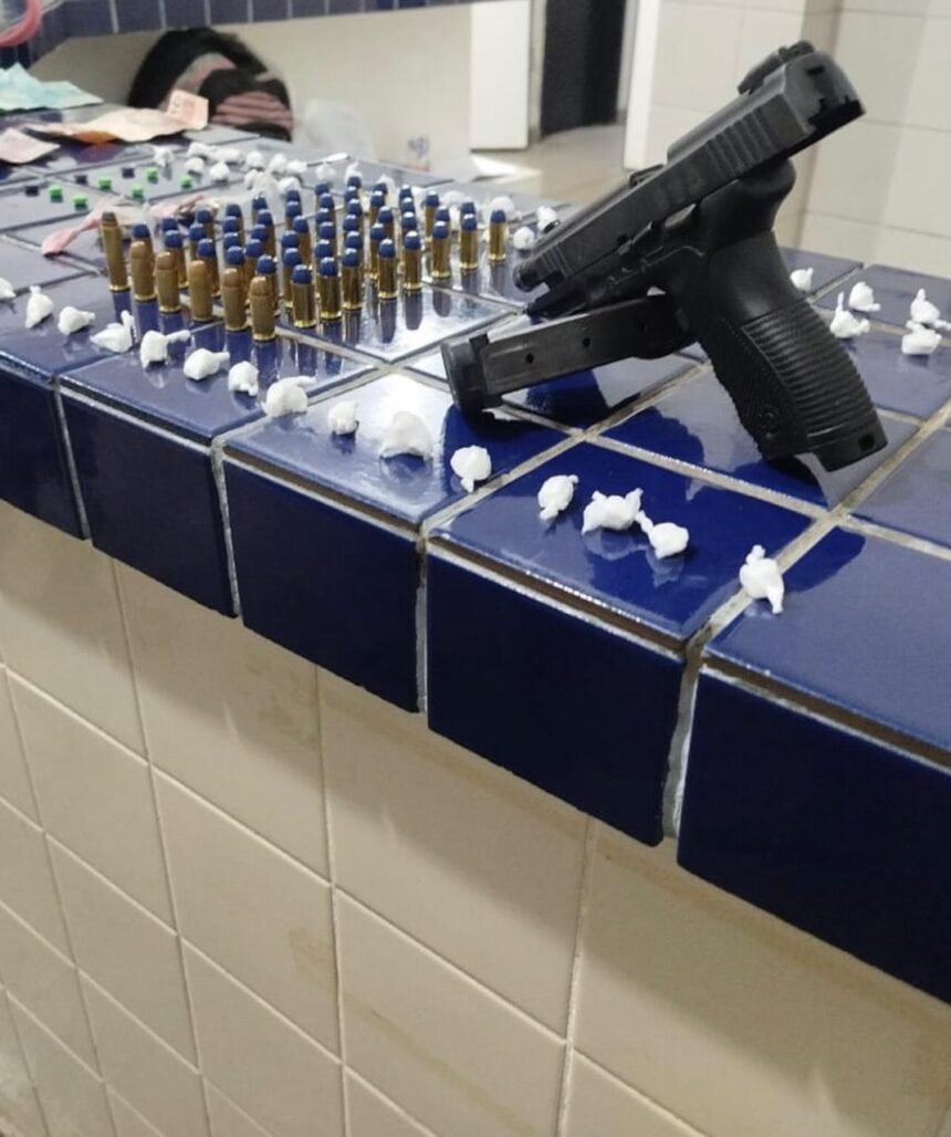 No local da abordagem foram encontrados: uma pistola Taurus 24/7, calibre .40, com o brasão da Polícia Civil de São Paulo, munições de calibres .40 e .357, uma motocicleta Honda Bros com restrição de furto oriunda da cidade de Dom Basílio, 65 trouxinhas de substância análoga à cocaína; dois comprimidos de droga sintética, duas porções pequenas de substância análoga à maconha dois celulares e R$ 638,00 (seiscentos e trinta e oito reais) em espécie.