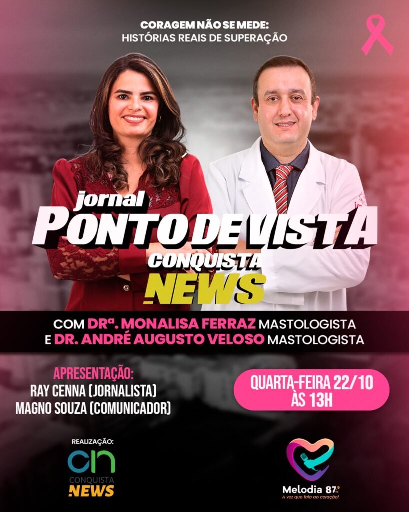 No estúdio da Rádio Melodia Conquista FM 87.9, com transmissão ao vivo pelo canal do YouTube, os apresentadores Ray Cenna e Magno Souza recebem os mastologistas Dra. Monalisa Ferraz e Dr. André Augusto Veloso para uma conversa inspiradora sobre prevenção, diagnóstico precoce, autocuidado e histórias reais de superação.