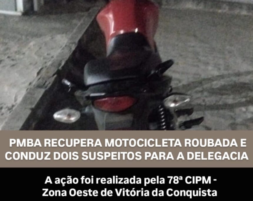 Na noite deste domingo (12), uma guarnição da 78ª CIPM recuperou no bairro Nossa Senhora Aparecida uma motocicleta com restrição que foi roubada mais cedo no bairro Ibirapuera por dois indivíduos.