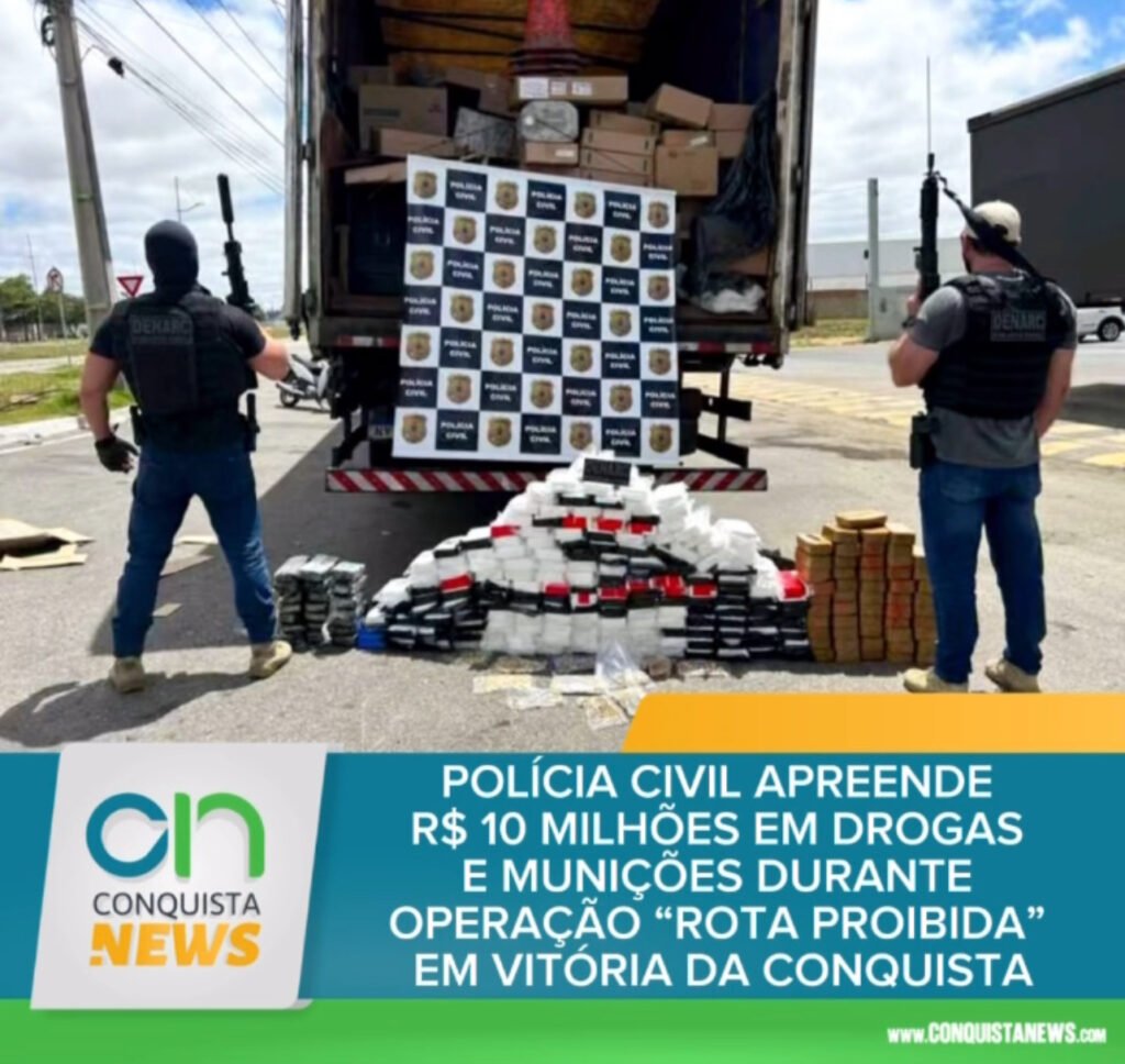 Uma grande operação da Polícia Civil da Bahia, por meio do DENARC / 8ª Delegacia de Tóxicos e Entorpecentes (DTE), resultou na apreensão de uma expressiva quantidade de drogas e na prisão de dois traficantes em flagrante, nesta segunda-feira (27), em Vitória da Conquista. A ação integra a Operação “Rota Proibida”, que tem como foco o combate ao tráfico interestadual de entorpecentes.