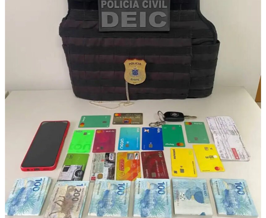 Com o flagranteado foram apreendidos diversos cartões bancários, um cheque nominado de dez mil reais, um aparelho de telefone celular, um automóvel Renault/Kwid de cor branca ano 2024, além da quantia em dinheiro já mencionada.