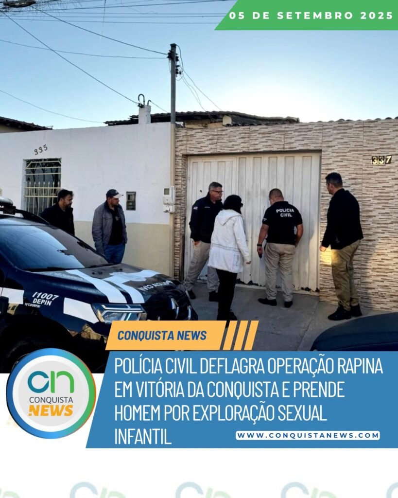 Na manhã desta sexta-feira (05/09/2025), a Polícia Civil da Bahia, por meio do Núcleo da Criança e do Adolescente-10a Coorpin, em conjunto com a Coordenação de Repressão a Crimes Cibernéticos Relacionados ao Abuso Sexual InfantoJuvenil (PF/Brasilia/DF) deflagrou a Operação Rapina, visando combater a disseminação de conteúdo de exploração sexual infantojuvenil.
