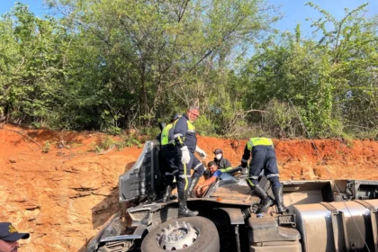 Carreta tomba na BR-116, carga é saqueada e veículo acaba incendiado; motorista fica preso às ferragens e é resgatado