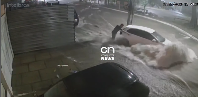 Na Avenida Ascendino Melo, local recorrente de alagamentos, um carro foi totalmente coberto pela enxurrada e arrastado com a força da água. Em imagens enviadas ao Conquista News, é possível observar o momento em que o carro fica submerso:
