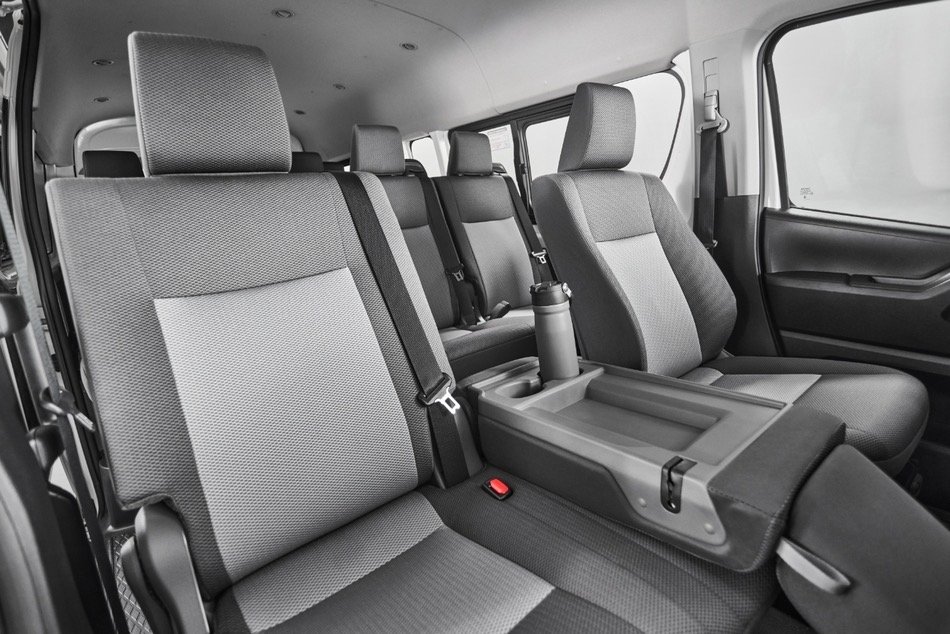 No interior, o conforto é um destaque: assentos traseiros reclináveis, saídas de ar-condicionado individuais, banco dianteiro central rebatível que vira apoio ou porta-copos, além de uma multimídia de 9 polegadas. Na segurança, a Hiace traz três airbags, controles de tração e estabilidade, assistente de partida em rampa, câmera de ré e sensores de estacionamento.