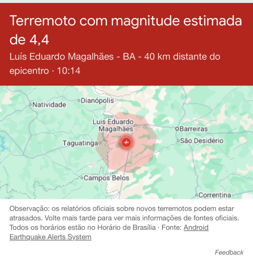 Um terremoto, com magnitude estimada em 4,4 MW, foi registrado na manhã desta terça-feira (14), por volta das 10h14, na cidade de Luís Eduardo Magalhães e em outras localidades da região Oeste da Bahia.