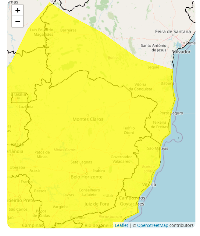 Ainda segundo o aviso do Inmet, há baixo risco de corte de energia elétrica, queda de galhos de árvores, alagamentos e descargas elétricas.