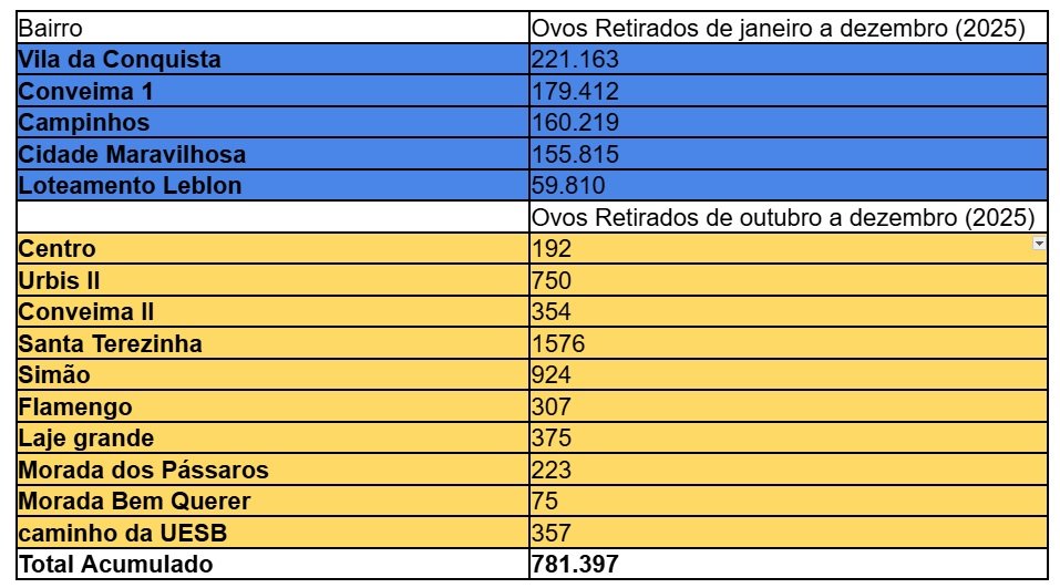 Vitória da Conquista obteve resultados expressivos no combate à dengue em 2025, com redução de 92,3% nos casos em relação a 2024, graças às ações da Secretaria Municipal de Saúde (SMS), por meio da Coordenação de Controle de Endemias. O uso de ovitrampas, tecnologia de monitoramento e remoção de vetores foi combinado com educação em saúde e visitas domiciliares, eliminando 781.397 ovos o mosquito Aedes aegypti.